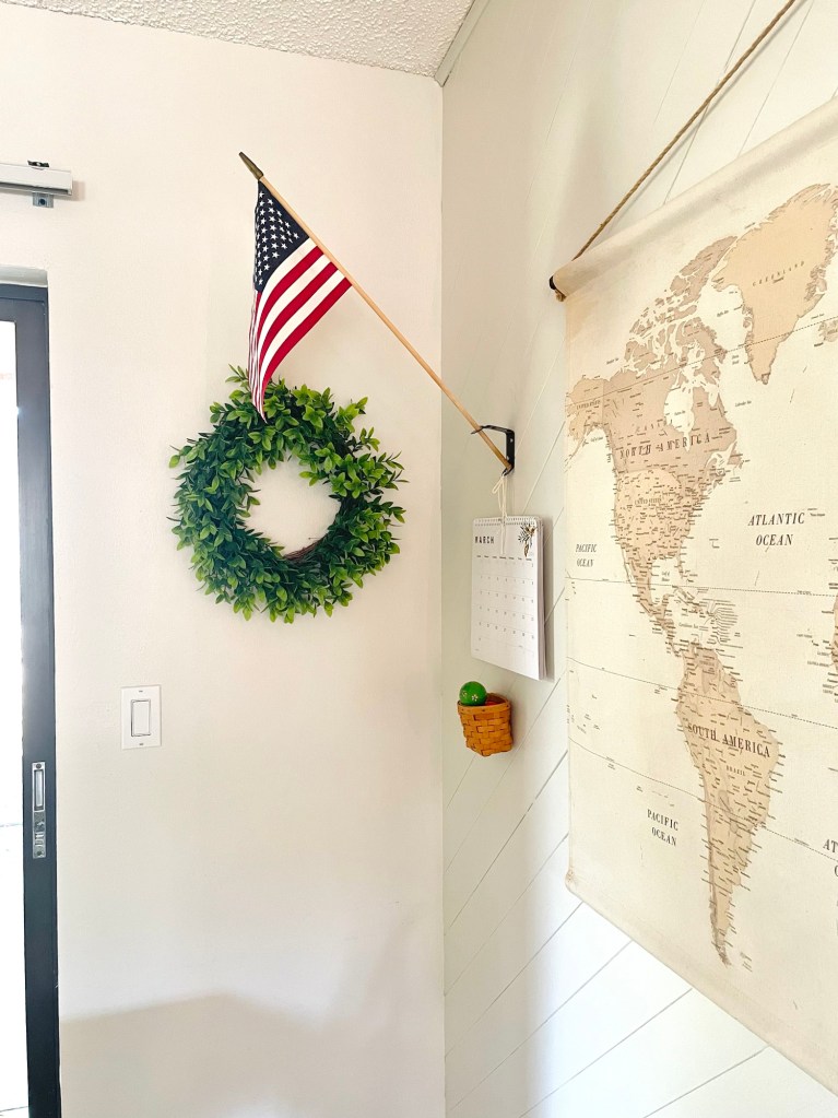Finally, we have a small chalkboard and this World Map Tapestry that we use on occasion. As she gets older, I’m sure we’ll utilize the chalk board more AND refer to a more accurate map.
