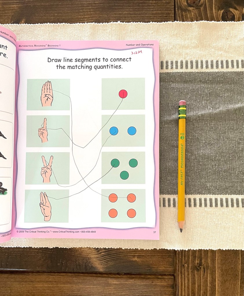 This was recommended highly by my friend, Hannah, who blogs over at Just Bee Blog. I decided to take the plunge and try it out, and I have been blown away by how well this workbook is designed. It is the perfect fit for my preschooler’s age, and again, her attention span. The book isn’t broken down into lessons, so you can take it as slowly (or quickly) as you desire. Some days, we do one or two pages. Other days, we might breeze through five! The scope and sequence makes so much sense and I am impressed with how well she grasps the concepts and enjoys the activities. As someone who really struggled with math, I want my children to have a solid understanding and foundation in mathematics, and so far, so good.