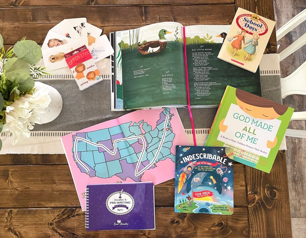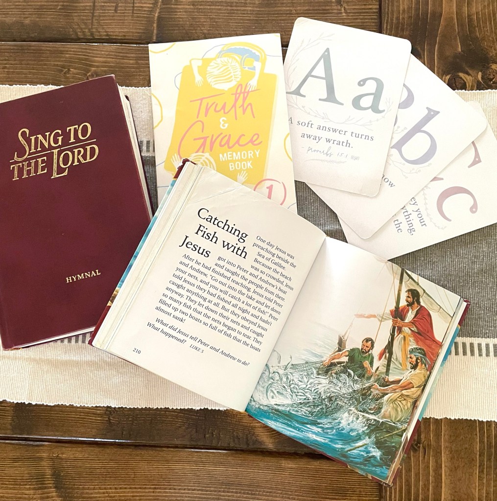 If you’re not familiar with what a morning basket is, I’ll refer you to this video by my friend, Hannah, as well as this podcast episode by Jami Balmet with Finding Joy in Your Home for more information. Basically, the idea is to pull a few resources out each day and rotate through them over the course of a week. This way, you don’t have to get to every single resource each day, but can be sure you’re hitting them all routinely.